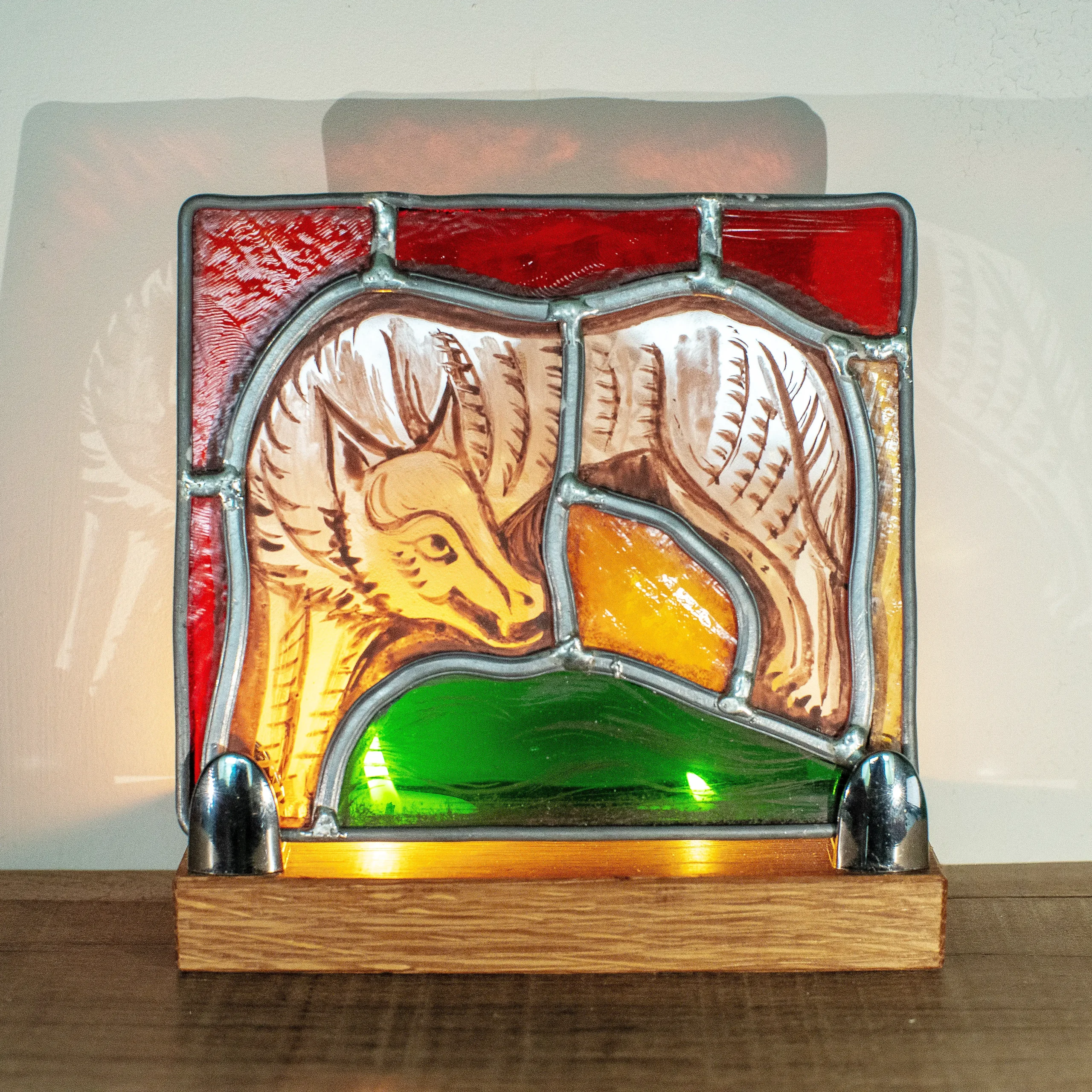 Petit vitrail unique représentant un loup dans le style du 13ᵉ-14ᵉ siècle. Le vitrail est monté sur un photophore en chêne, il est possible d’y placer des bougies chauffe-plat, créant un jeu de lumière chaleureux qui met en valeur le motif du loup.